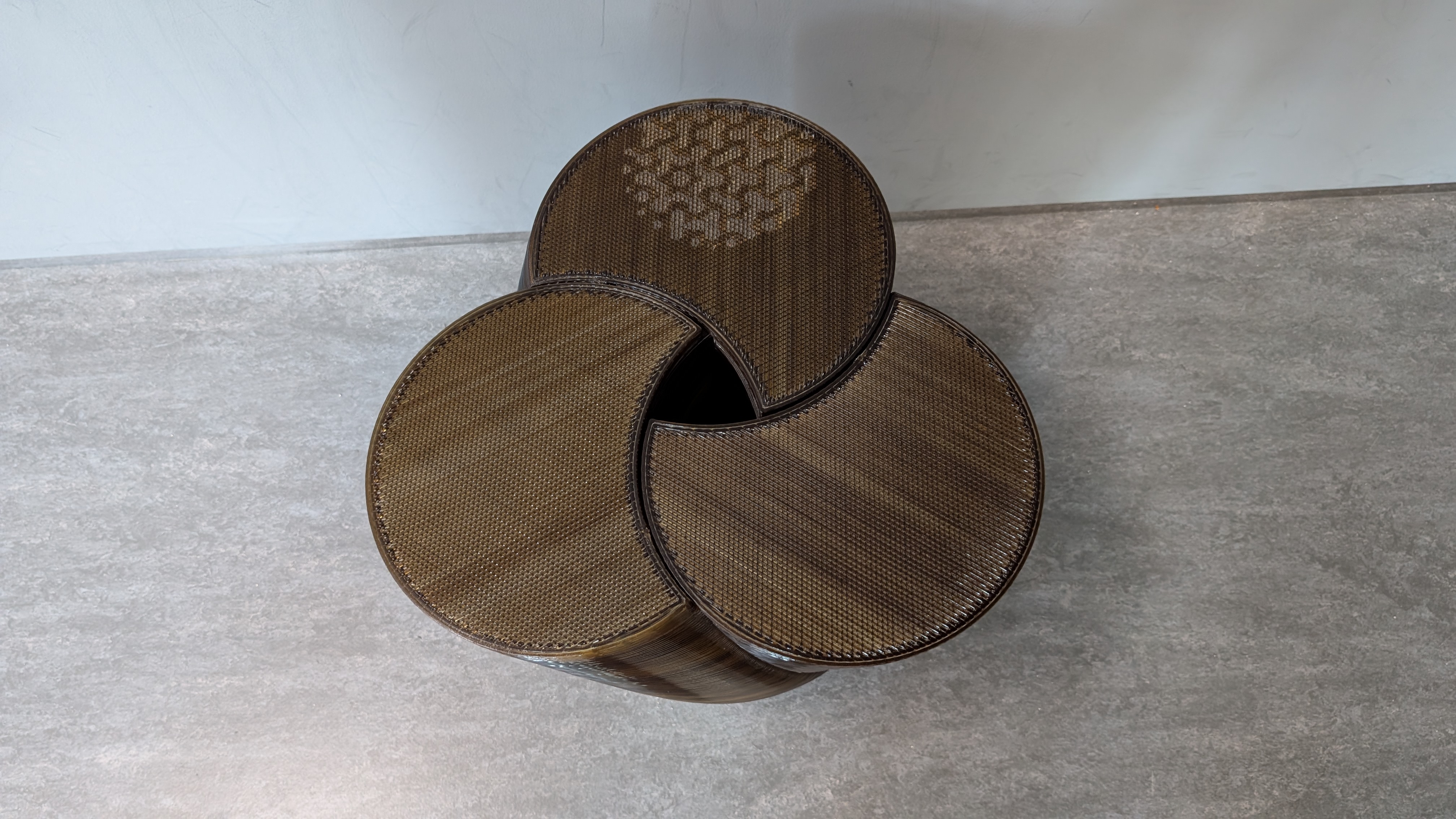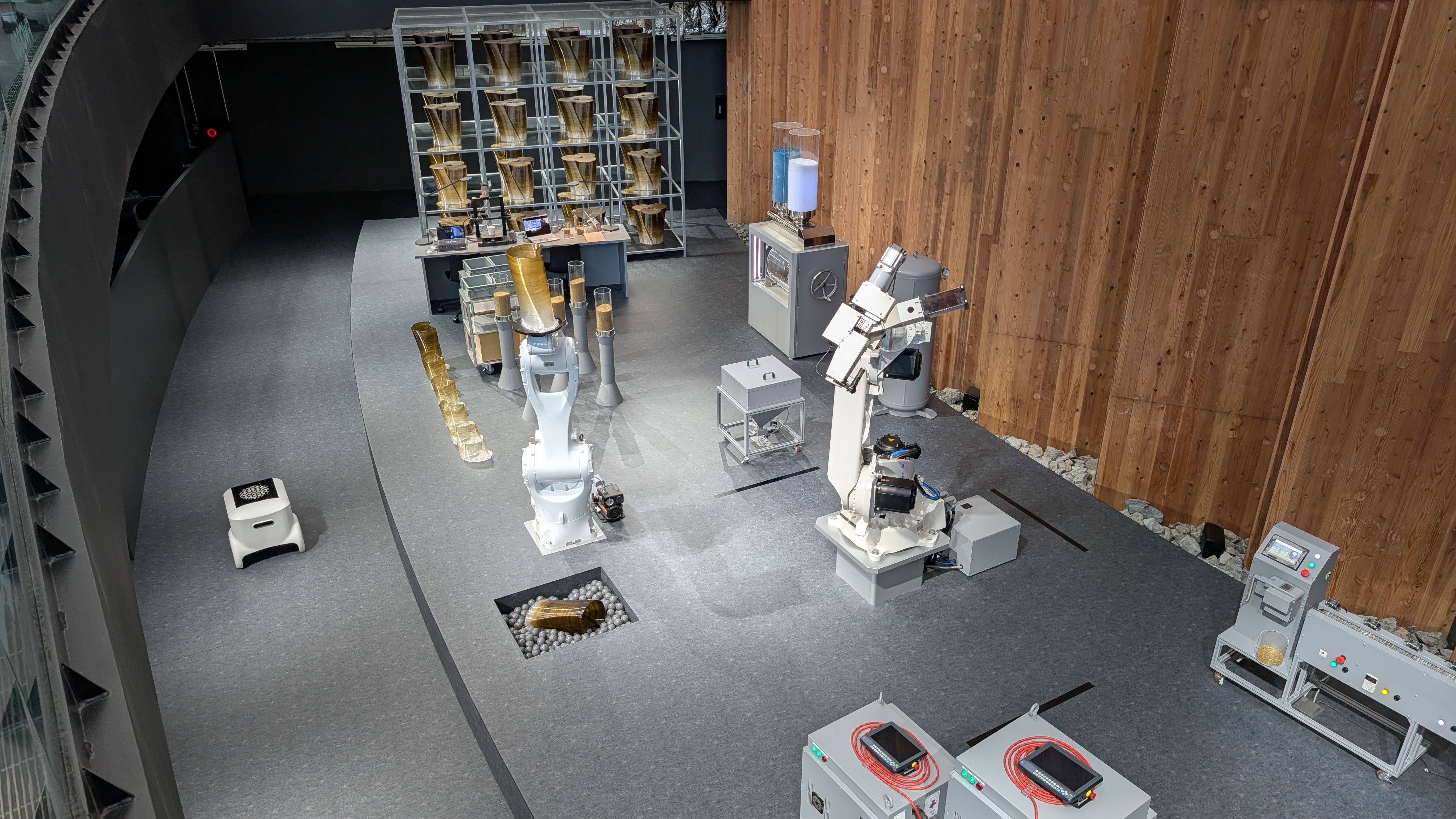 藻か何か、発酵させたものでイスを自動製造する機械と、出来上がったイス。
