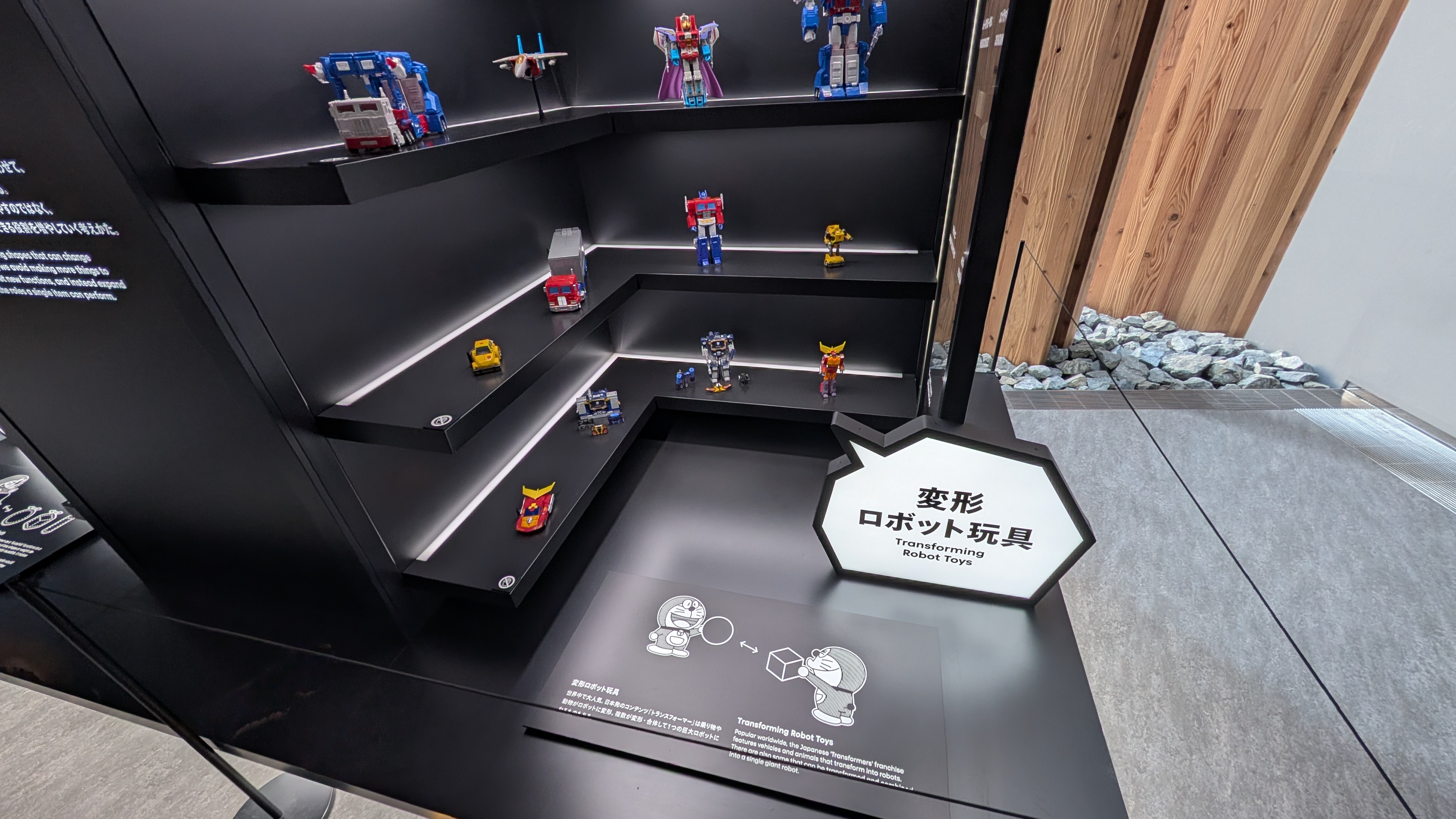 唐突に展示される日本の変形ロボット玩具と、ドラえもん。