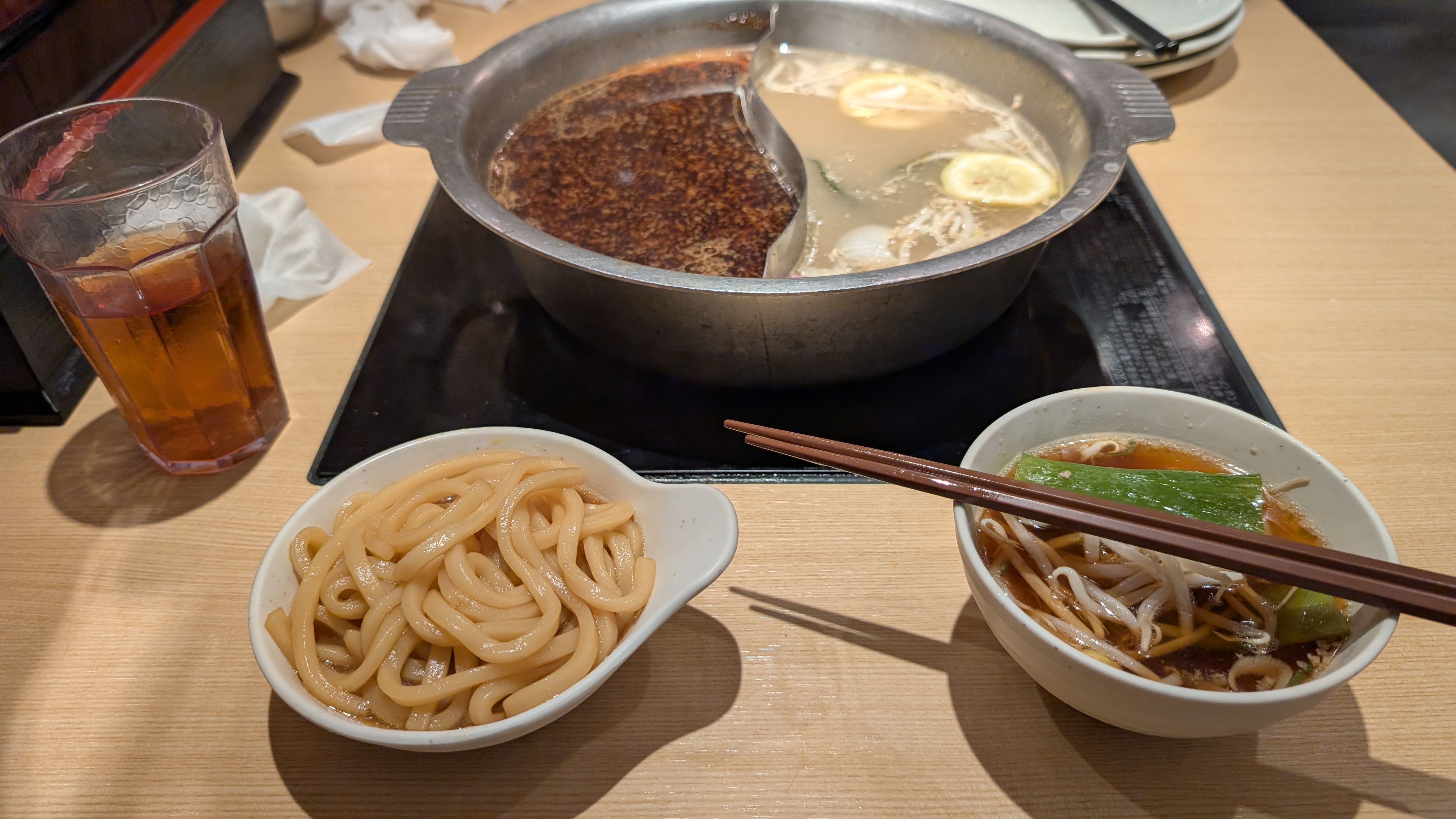 鍋の左側はすき焼きですが、右側は【期間限定】牛骨塩レモン出汁です。