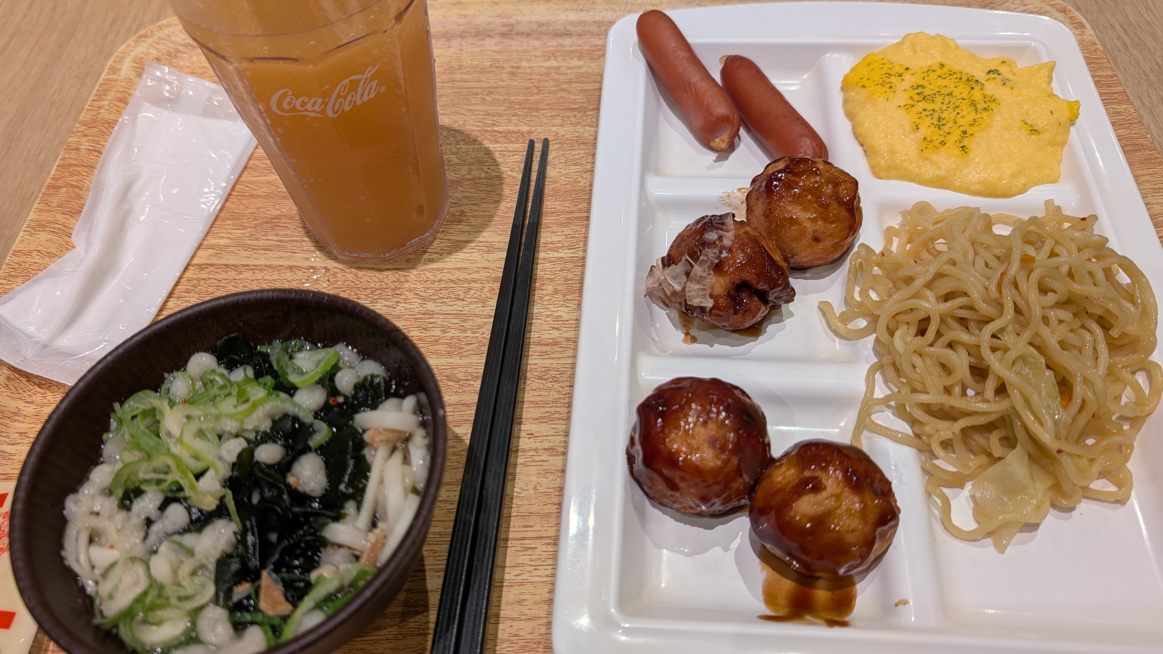 塩焼きそば、スクランブルエッグ、揚げたこ焼き(マヨあり)、ウインナー、かすうどん、ミニッツメイドアップル